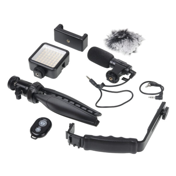 предназначен для быстрой организации видеосъёмки или стриминга с помощью камеры смартфона. В комплект входит все необходимое оборудование для получения качественного видео/аудиоконтента. Настольный штатив с держателем для смартфона предотвращает «шевеление» кадра. Светодиодный осветитель с регулируемой яркостью и световым потоком сбалансированного белого цвета помогает снимать яркую и контрастную картинку в естественных цветах. Микрофон с держателем и ветрозащитными насадками повышает качество записываемого звука. А селфи-кнопка дает возможность дистанционно управлять камерой смартфона по Bluetooth.