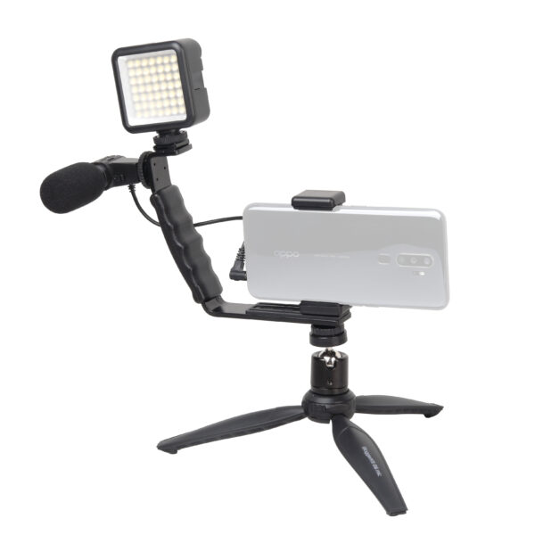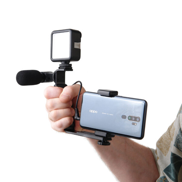 Накамерный осветитель и микрофон устанавливаются на кронштейне в крепления типа «башмак». Держатель смартфона крепится на винт 1/4”.
